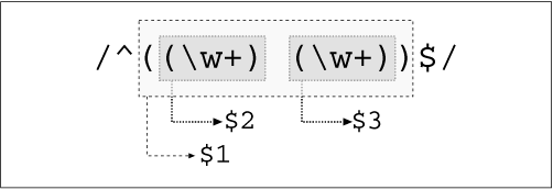 would capture "Primula Brandybuck" into $1, "Primula" into $2, and "Brandybuck" into $3. This is depicted in Figure 5-1.