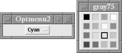 As a reminder, the menu items are radiobuttons, each of which accepts an -image option used when the radiobutton is not selected and a -selectimage option used when the radiobutton is selected. Essentially, we'll create two Photo images per radiobutton, a color swatch for the -image option, and a color swatch with a black border for the -selectimage option.
