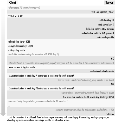 [25]The term "trusted-host" is our own; it refers to the Rhosts, SSH-1 RhostsRSA, and SSH-2 hostbased authentication methods as a related group.Let's follow this authentication process step by step: